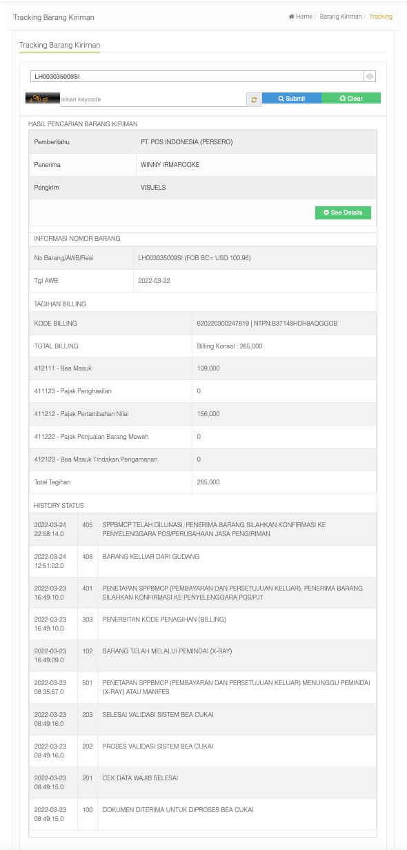 Selain di website EMS, kita juga harus melihat no resi kita di website bea cukai www.beacukai.go.id/barangkiriman untuk mengecek jumlah pajak yang harus dibayarkan seperti gambar di bawah ini.