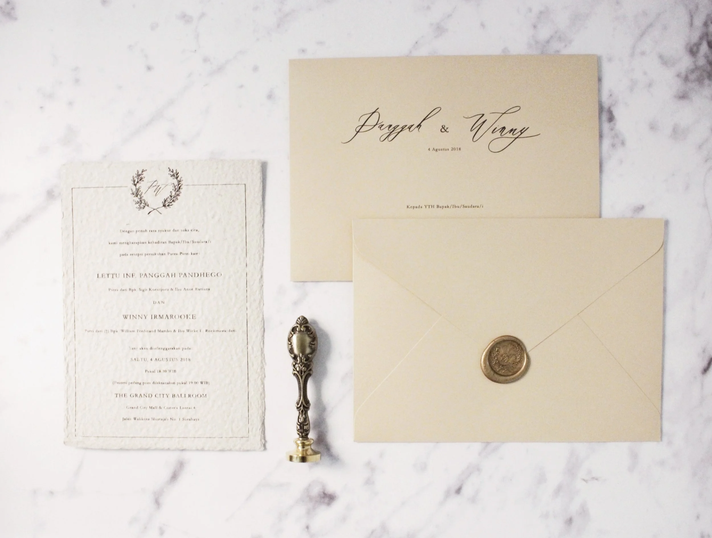 Punya impian untuk membuat undangan pernikahanku sendiri. Undangan pernikahan dengan tema rustic & romantic terbuat dari handmade paper dan dilengkapi dengan wax seal.