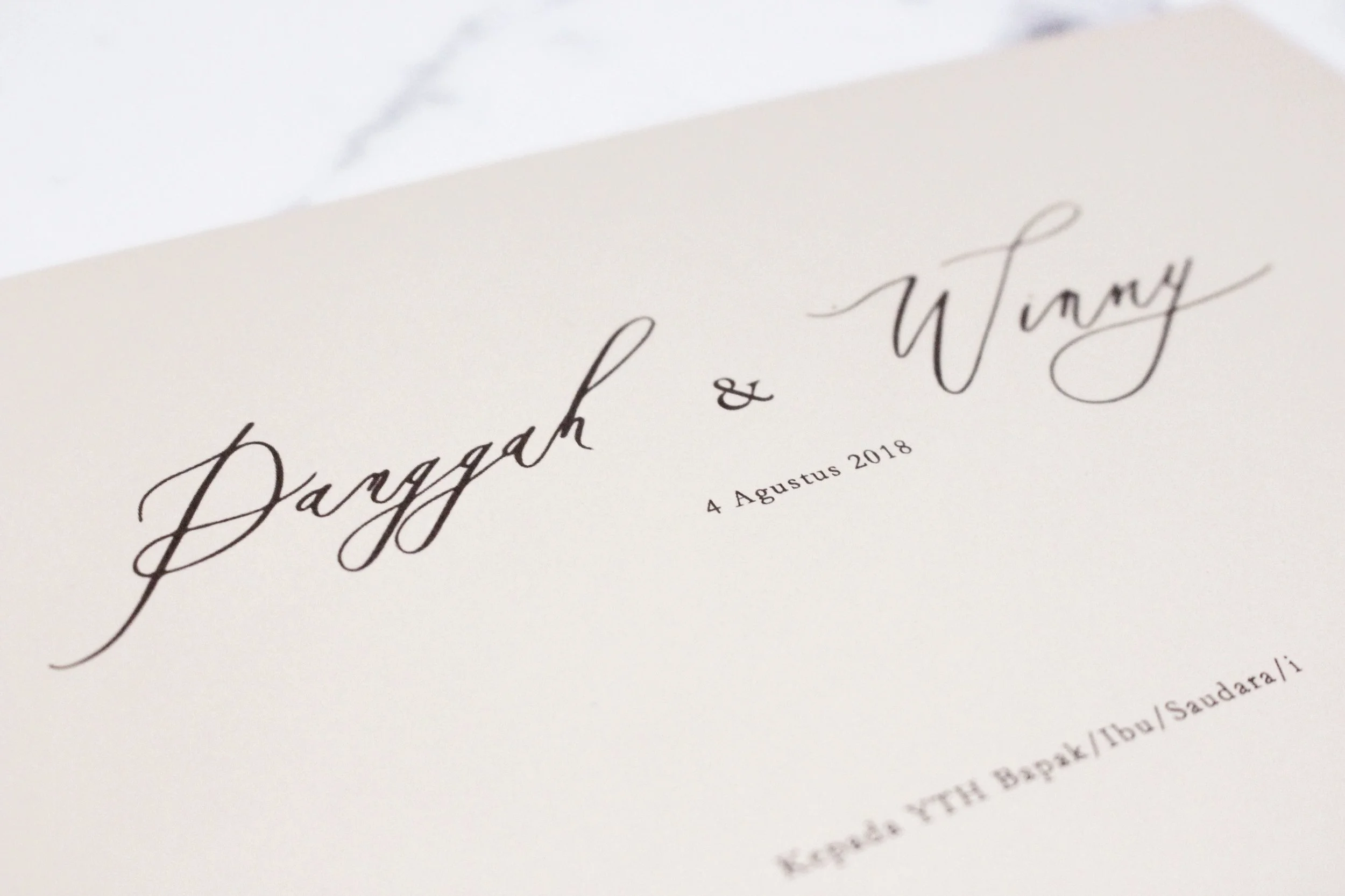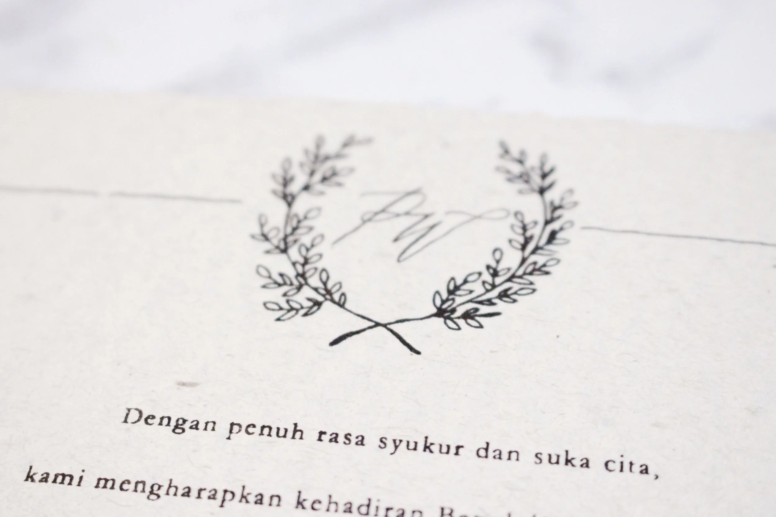 Awalnya, desain yang ingin saya buat adalah undangan yang lengkap semacam desain @writtenwordcalligraphy atau @truffypi dan semacamnya. Tapi setelah saya pikir lagi, daripada buang-buang kertas for the sake of aesthetic, saya memutuskan untuk membuat desain yang sederhana dan tidak memakai bungkus plastik. Dari rencana berlembar-lembar kertas dalam satu undangan menjadi satu lembar undangan. Kalo bisa ngga usah pake undangan fisik, tapi ya nggak mungkin kan ya.